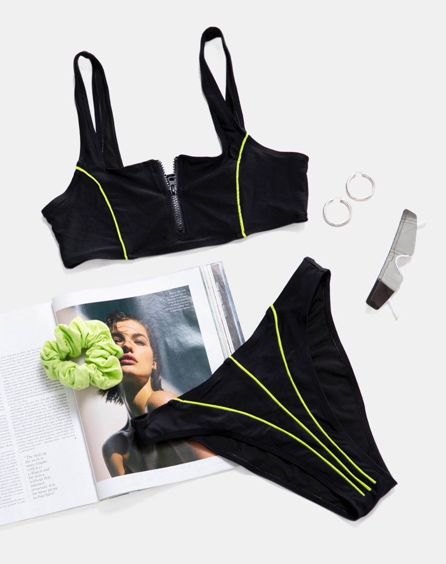 Dive into this bright and bold bikini for poolside chic. The shielle bikini comes in a black with contrast piping and features a cropped fit with chunky straps and zip detail. Pair with the matching bottoms and all you need is an excuse to wear!
