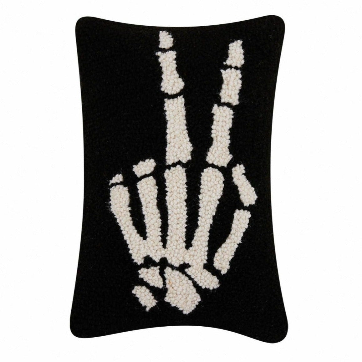 Fun and festive, this Skeleton Peace Pillow will add a fa-boo-lous touch to your Halloween home decor. This accent pillow is delicately crafted out of hooked wool, and would compliment any spooky Halloween decor for home this season.