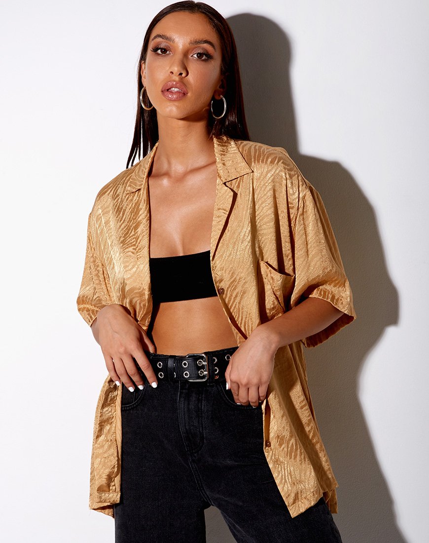 Our Taelsa shirt could be your next satin staple piece! In a shiny but subtle zebra caramel print, it features an oversized fit with a lapel collar, short sleeves, v-neckline, and button-up front. Wear over a Micro top, some black jeans, and our PU Double Grommet Belt.