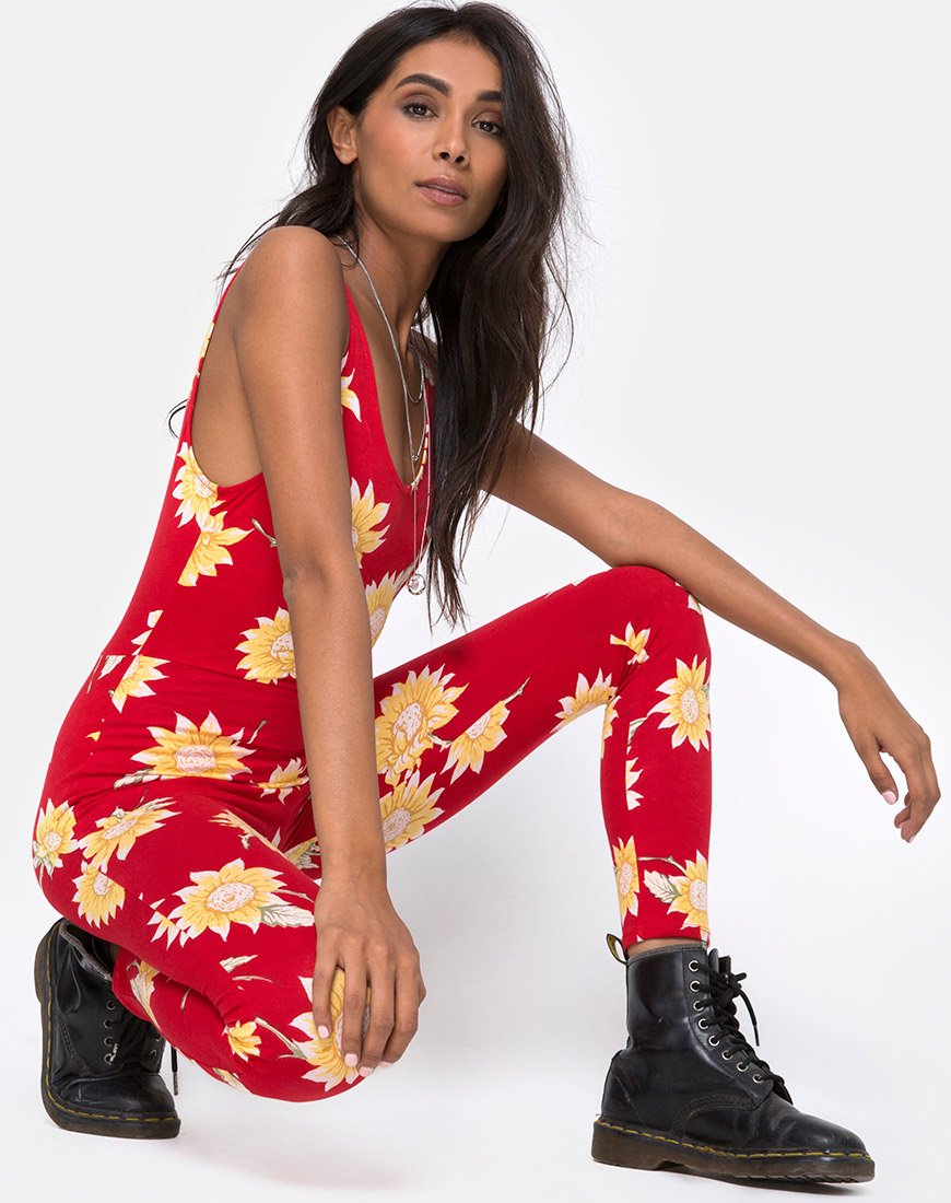 The only item you need to own this season, our unitard in sunny days. Red hot with fresh florals, it's got summer all over it. In a red and yellow sunflower print it features an all over bodycon fit with long leg, scoop back and chunky straps. Festival, holiday or everyday, this will be your new go-to.