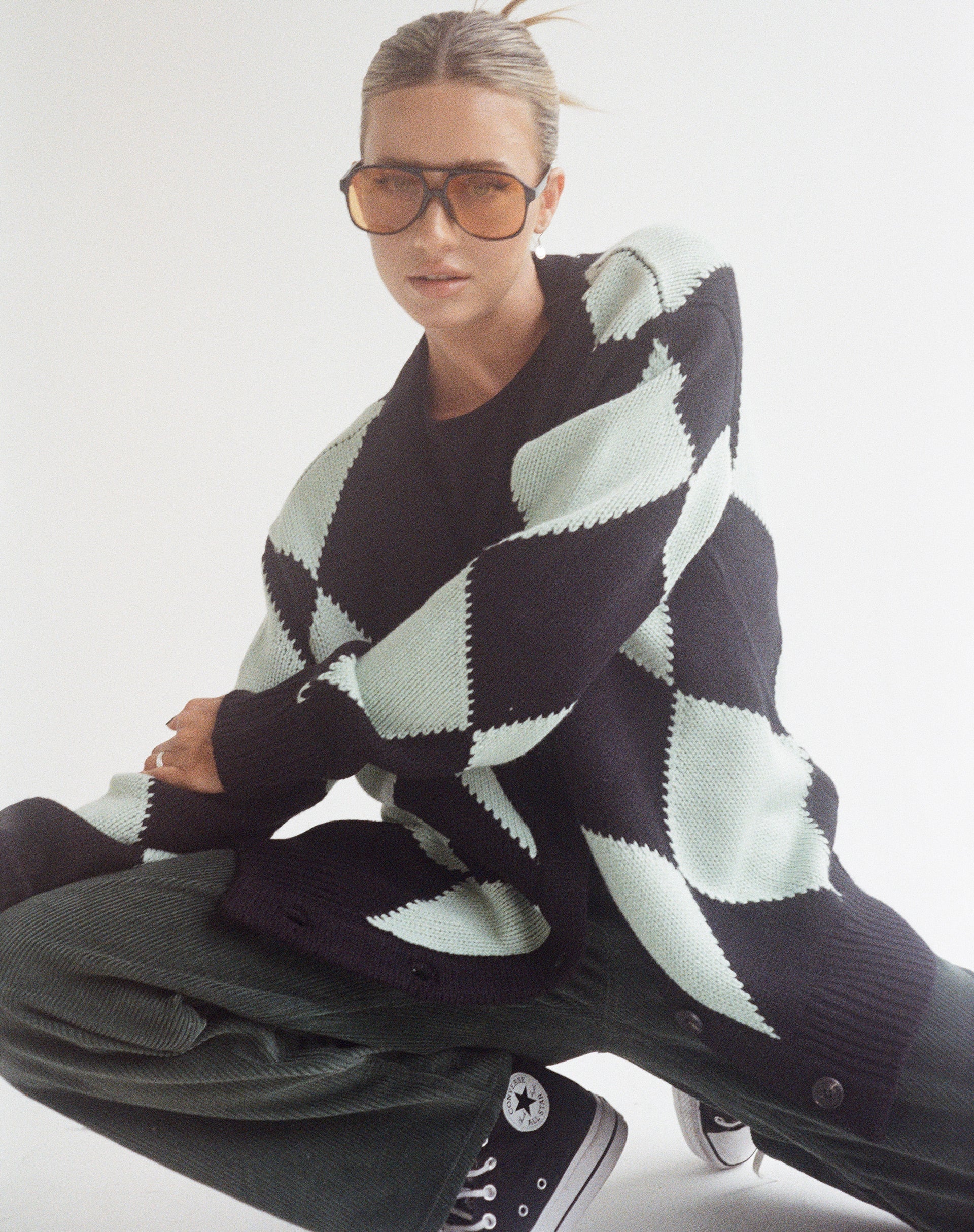 Stock up on new layers with the Uriela cardigan. Featuring long sleeves, v neckline and button up front in a black and mint harlequin print. Layer over a black crop and our Ima skirt in twill black.