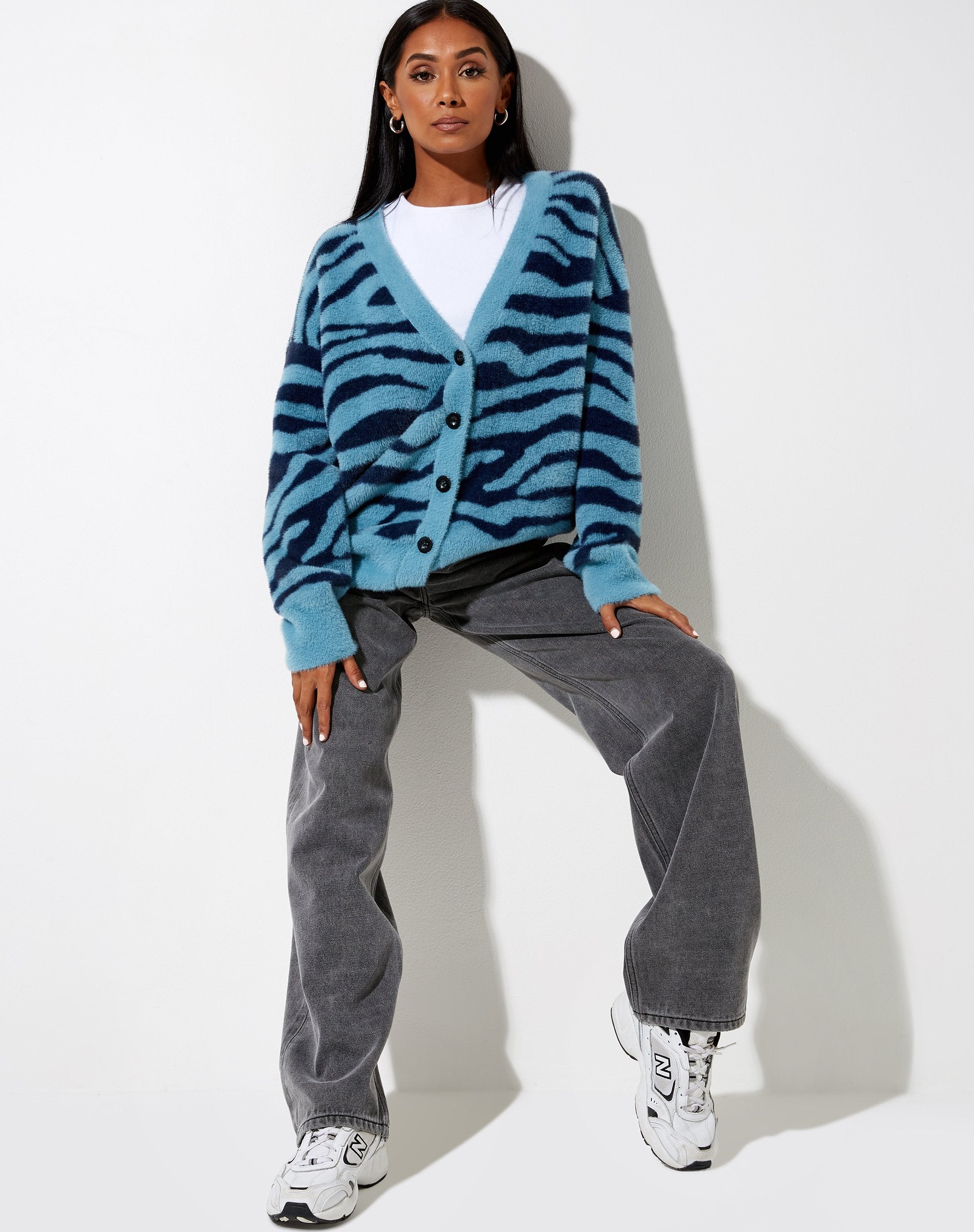 Knitwear, we're here for you. Th Uriela cardi in a blue and zebra print, features long sleeves, v neckline and button up front. Wear it open or done up with your fave denim.