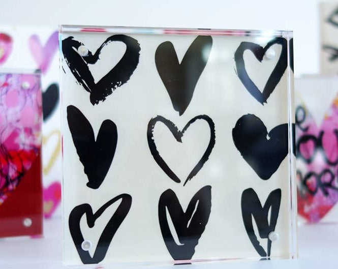 These fun and funky acrylic frames adorn Valentine hearts and sweet messages for loved ones, family and friends! Free-standing and double-sided. These cuties and their messages bring vivid color and joy to any living space. Who can resist them?