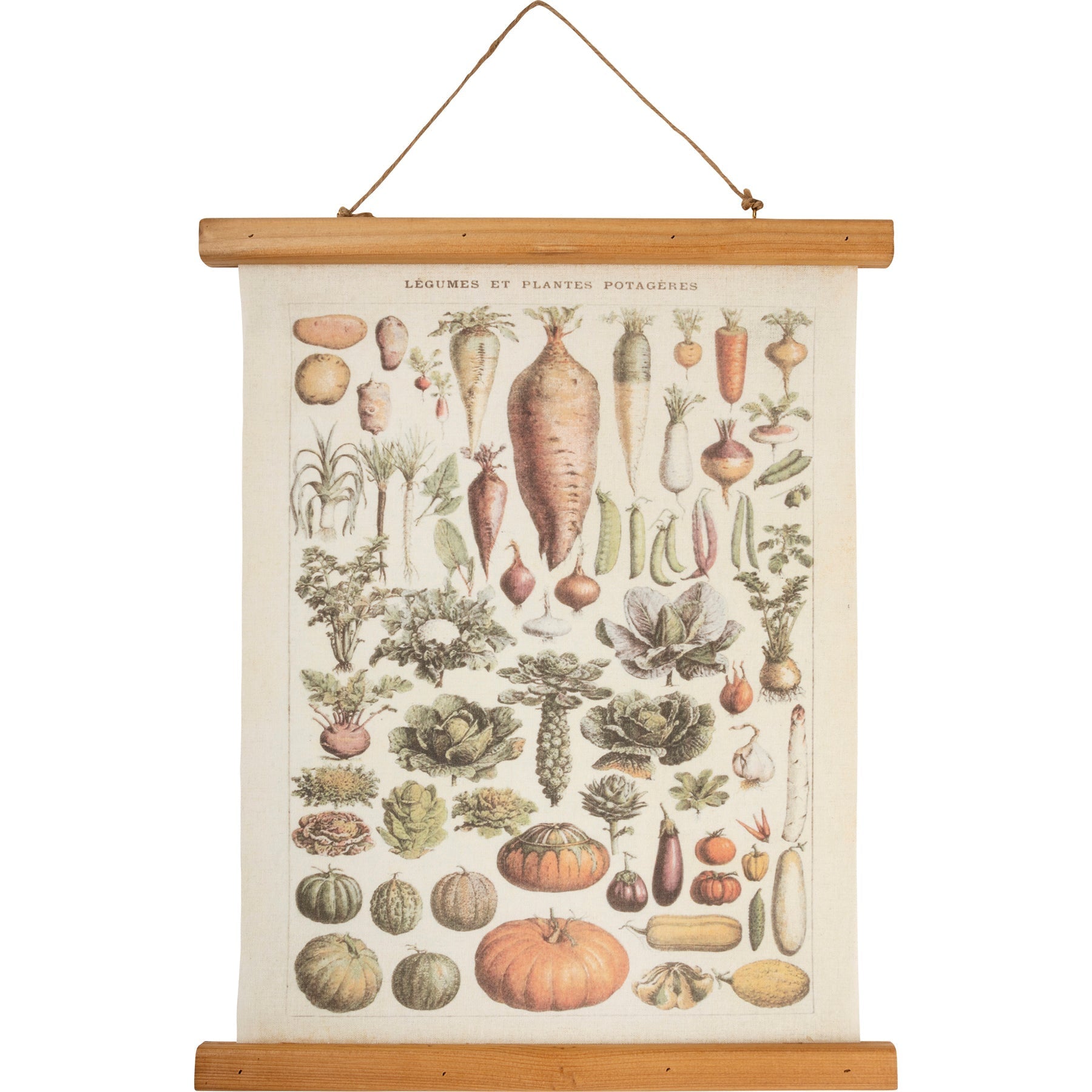 A wall décor piece featuring a variety of vegetables and a cream palette on canvas, stretched between two pieces of wood.