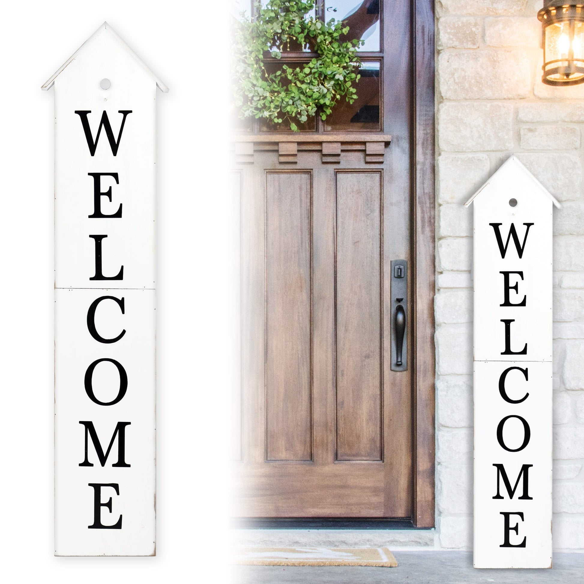 Welcome your guests with a touch of charm with this 48in wooden porch sign with house shape. Choose from black, white, or brown to match your decor and add a touch of sophistication to your home. The folding function allows for easy storage when not in use, making it perfect for seasonal displays.