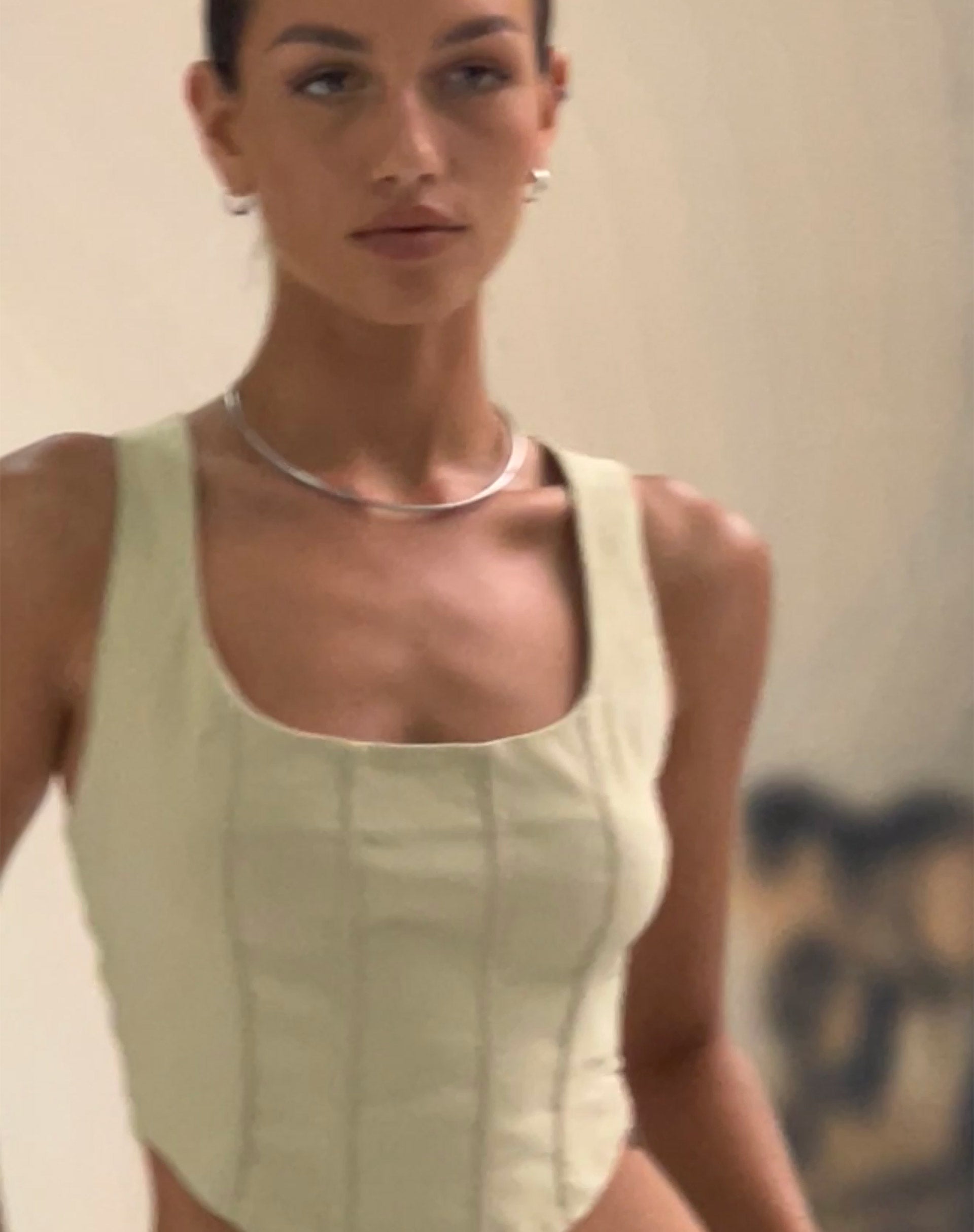 Beige corset style top with a cropped fit, square neckline and thick straps. Style with our Hansa Cargos.