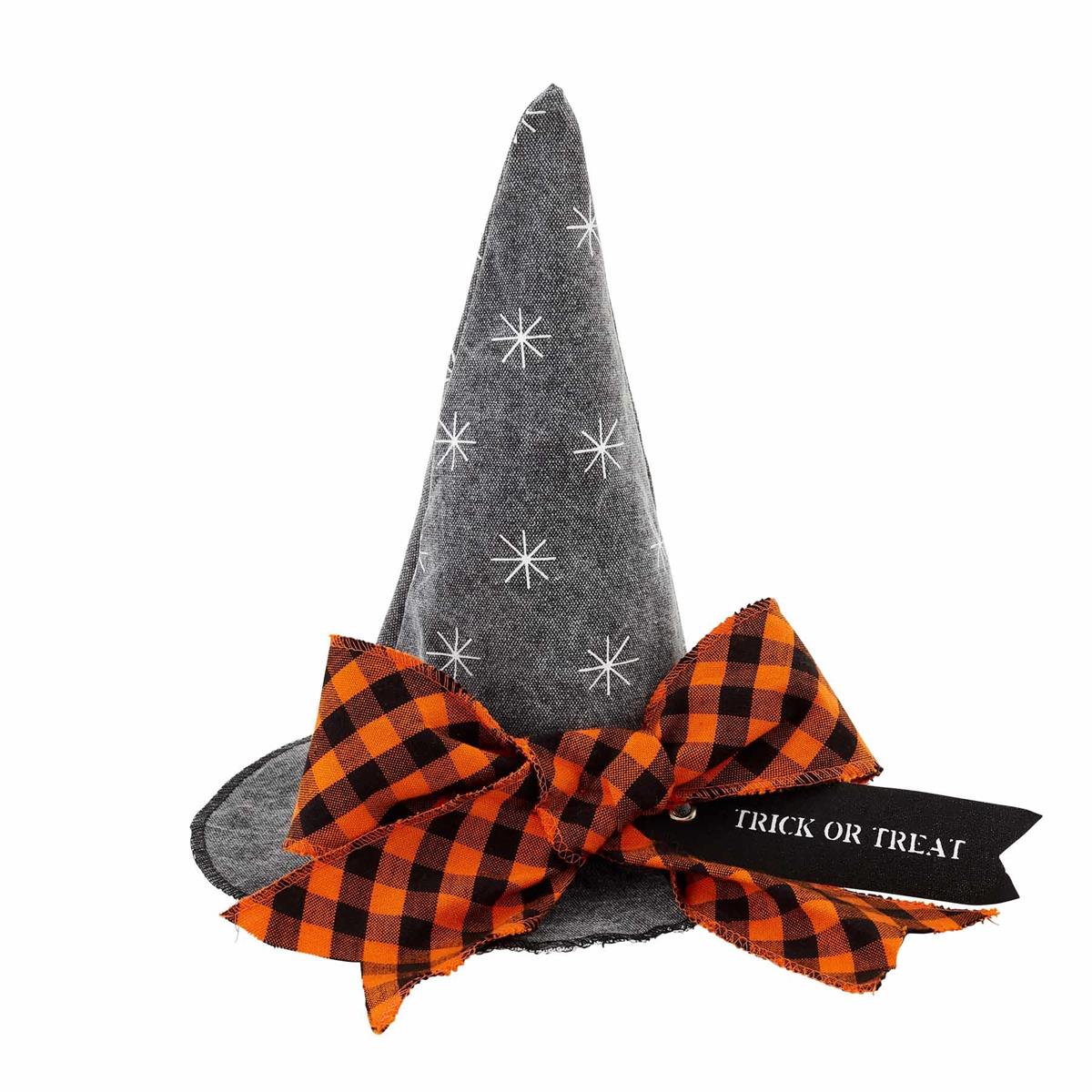 Medium: Washed canvas witch hat sitter with buffalo check bow and printed canvas sentiment tag.