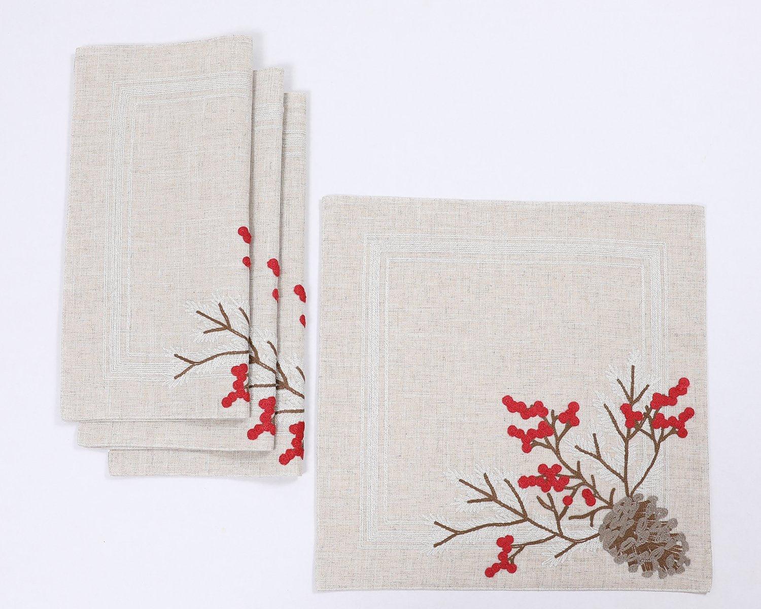 Product description: You'll love the festive look of these Christmas Pine Cone Crewel Embroidered Placemats! This unique design features intricate pine cones and holly berry branches textured crewel embroidered on a natural linen and polyester blend fabric. The double layers are reversible for added convenience. Plus, they're wrinkle and stain resistant for easy care. Perfect for adding a warm and inviting touch to your holiday meals and gatherings! Matching placemats and table runner available. Get ready to enjoy Christmas dinner with these beautiful holiday linens!