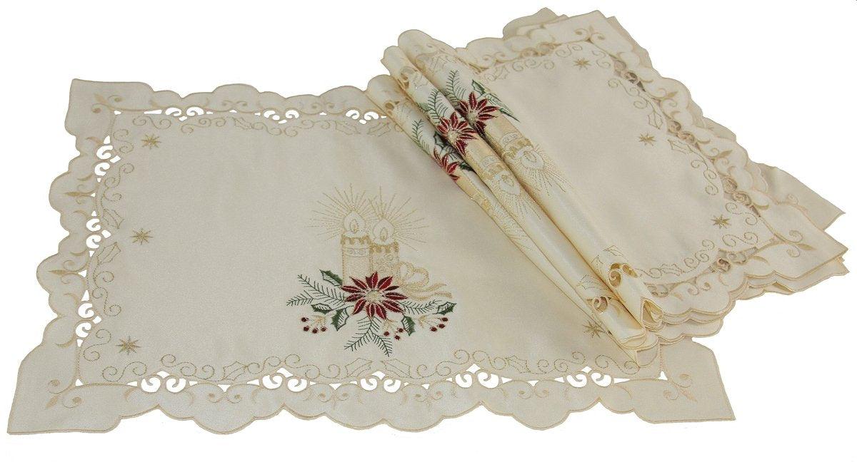 Exquisite embroidery of Christmas candles are the centerpiece on this cutwork table runner. Golden lycra accents give this runner the warm glom of a magical holiday evening. Made from easy care poliviscose and machine washable. Both inspiring and inviting, this head turning design will instantly become the centerpiece of any room.