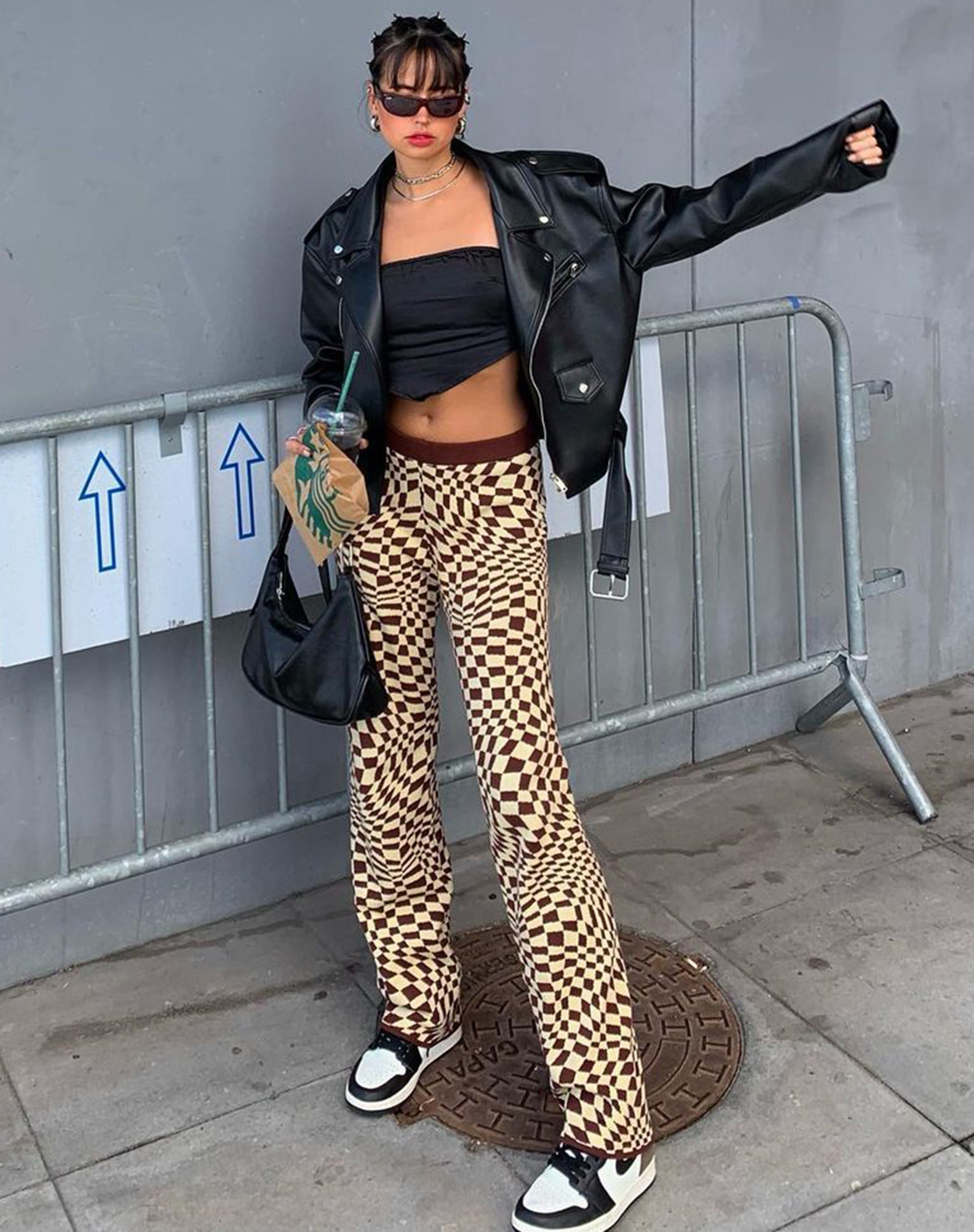 A printed trouser is a wardrobe must have. Our Yuna features a high waisted fit with straight leg in a knit coffee brown square flag print. Style with the Lagia top in white and add a chunky sandal.