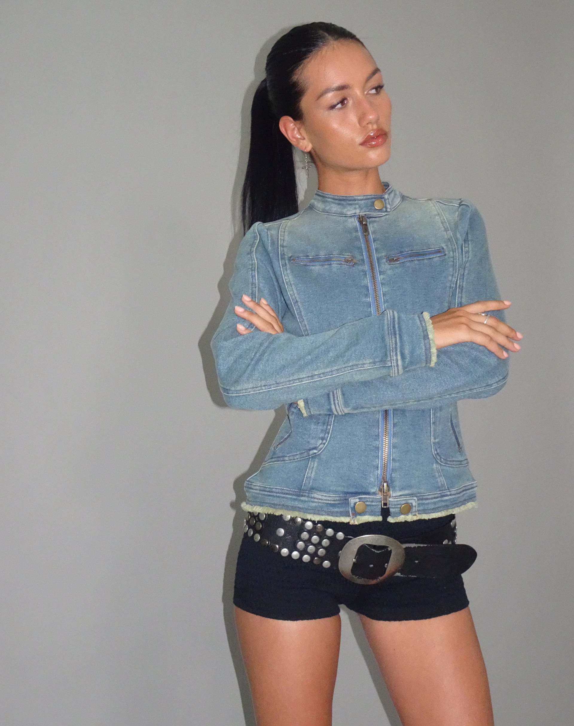 Zayn Fitted Biker Jacket in Vintage Blue Denim