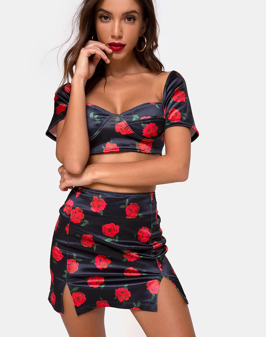 Have you found the right girls night out outfit yet? Now you have!! Look no further with the Zida skirt it features a high waist, cute rose print, and symmetrical splits. Pair with the matching top for the full lewk!